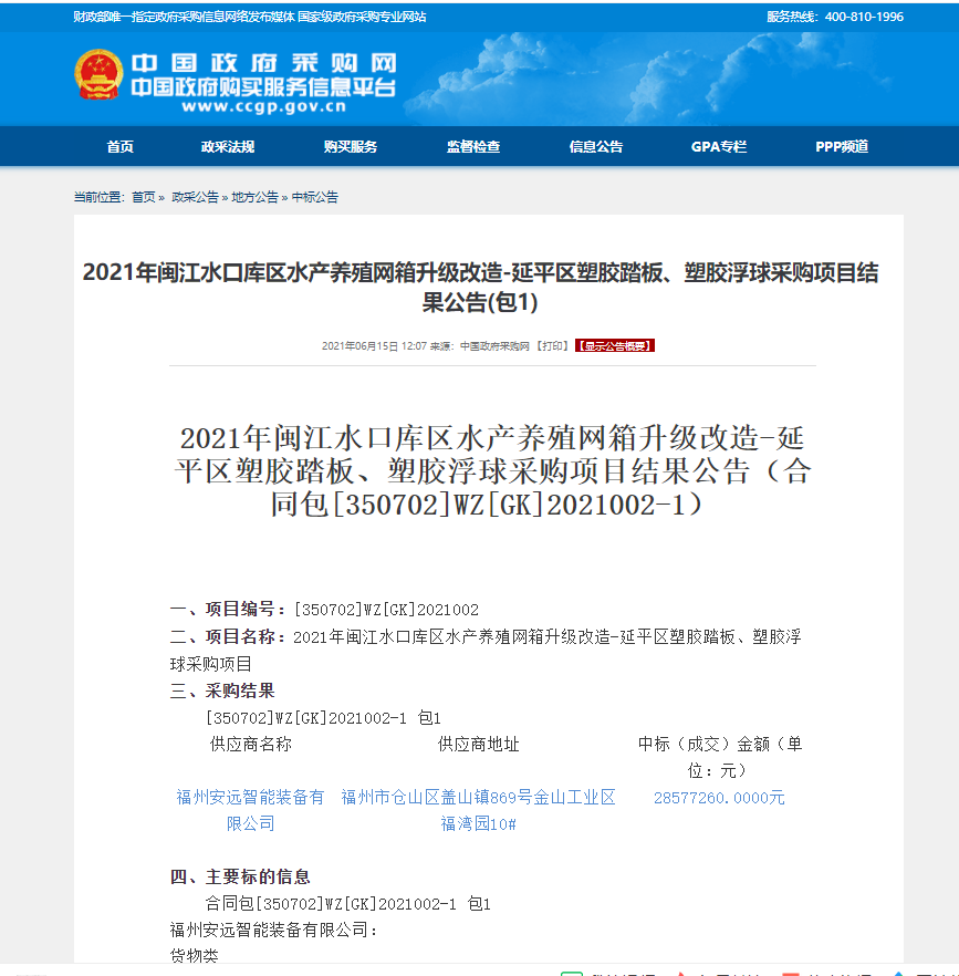 2021年6月15日,开云手机站登入公司权属企业安远公司成功中标闽江水口库区水产养殖网箱升级改造-延平区塑胶踏板、塑胶浮球采购项目。该项目将在延平区漳湖镇龙池、坂头、林经、上坂、中和等14个村开展网箱升级改造工作,改造总面积达60万平方米。