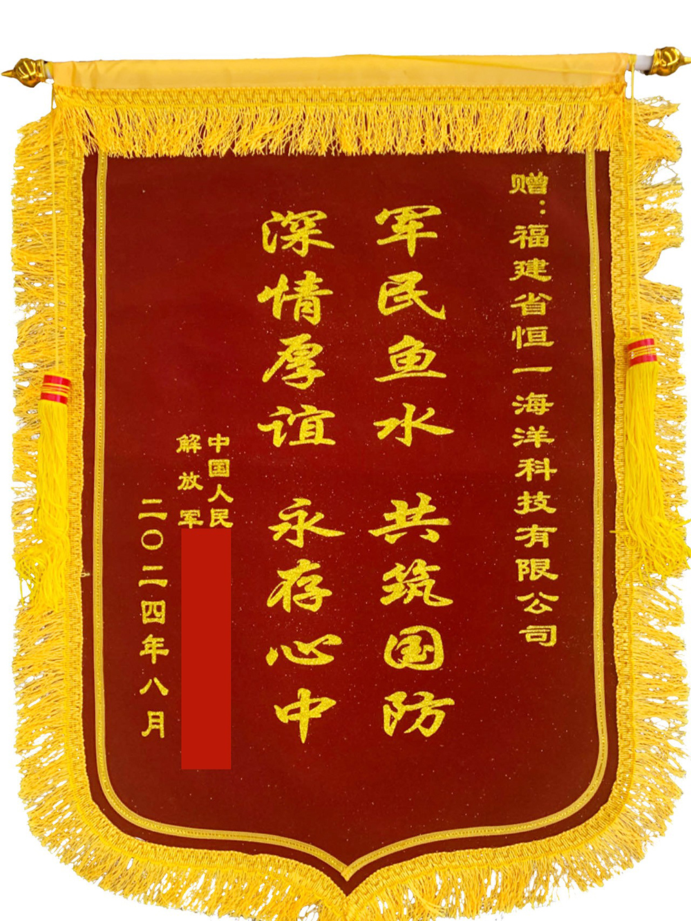 近日,中国人民解放军某部为开云手机站登入集团权属企业开云手机站登入海科公司赠送一面写有“军民鱼水 共筑国防 深情厚谊 永存心中”的锦旗,以感谢公司在部队驻训期间提供的支持。